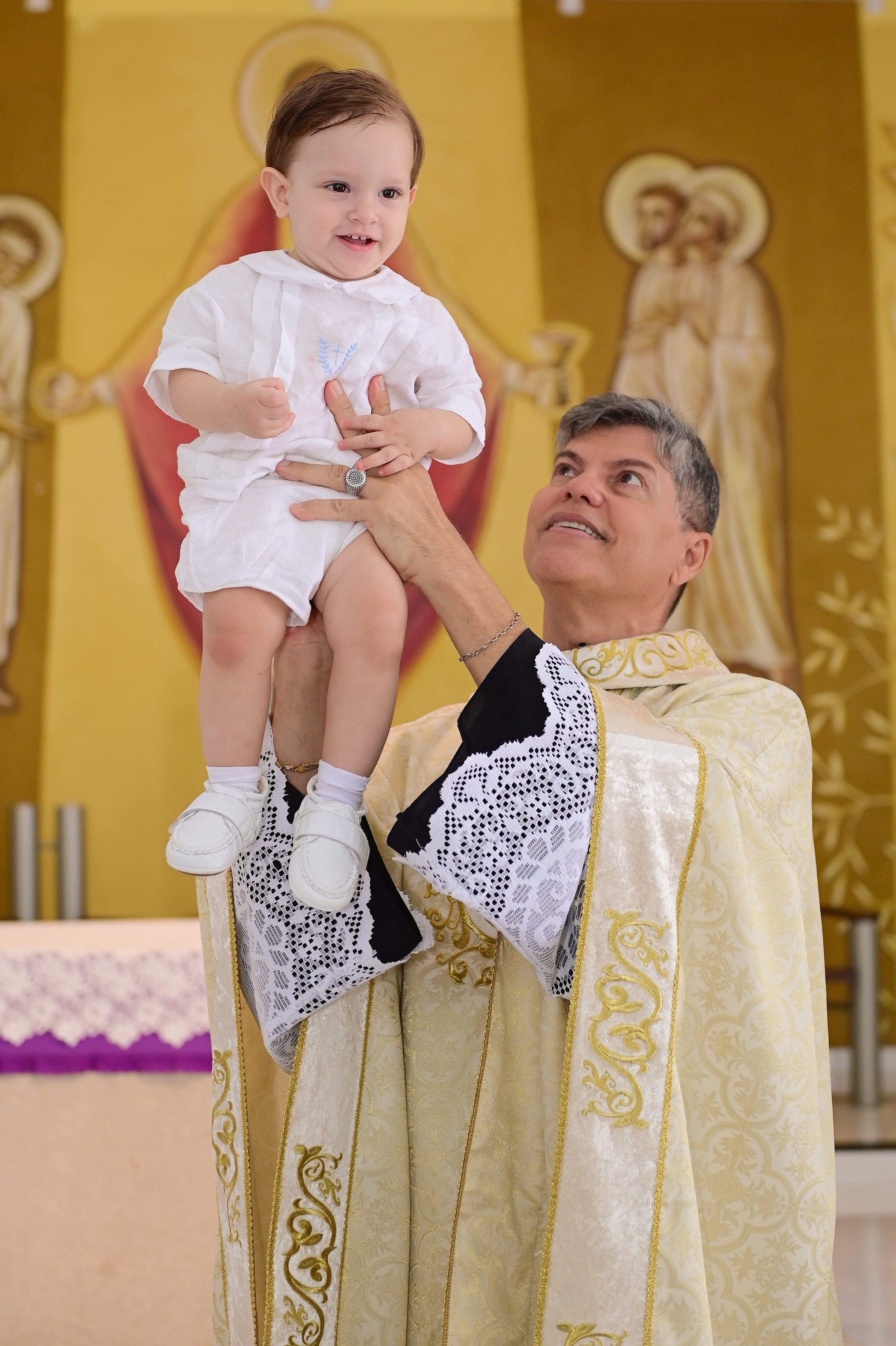 Em cada foto, a luz natural foi minha maior aliada: ela cai suavemente sobre as memórias, desenhando contornos gentis nos rostos e aquecendo o ambiente com tonalidades douradas. A cerimônia na igreja Santo Antônio revela um encontro de gerações: avós que guardam a memória de um tempo de fé, pais que sonham com o futuro do filho, familiares que sorriem e se emocionam juntos. A paleta de cores, as texturas da igreja e o silêncio respeitoso reforçam a dignidade do ritual, enquanto o pequeno Pedro encanta com sua presença serena.